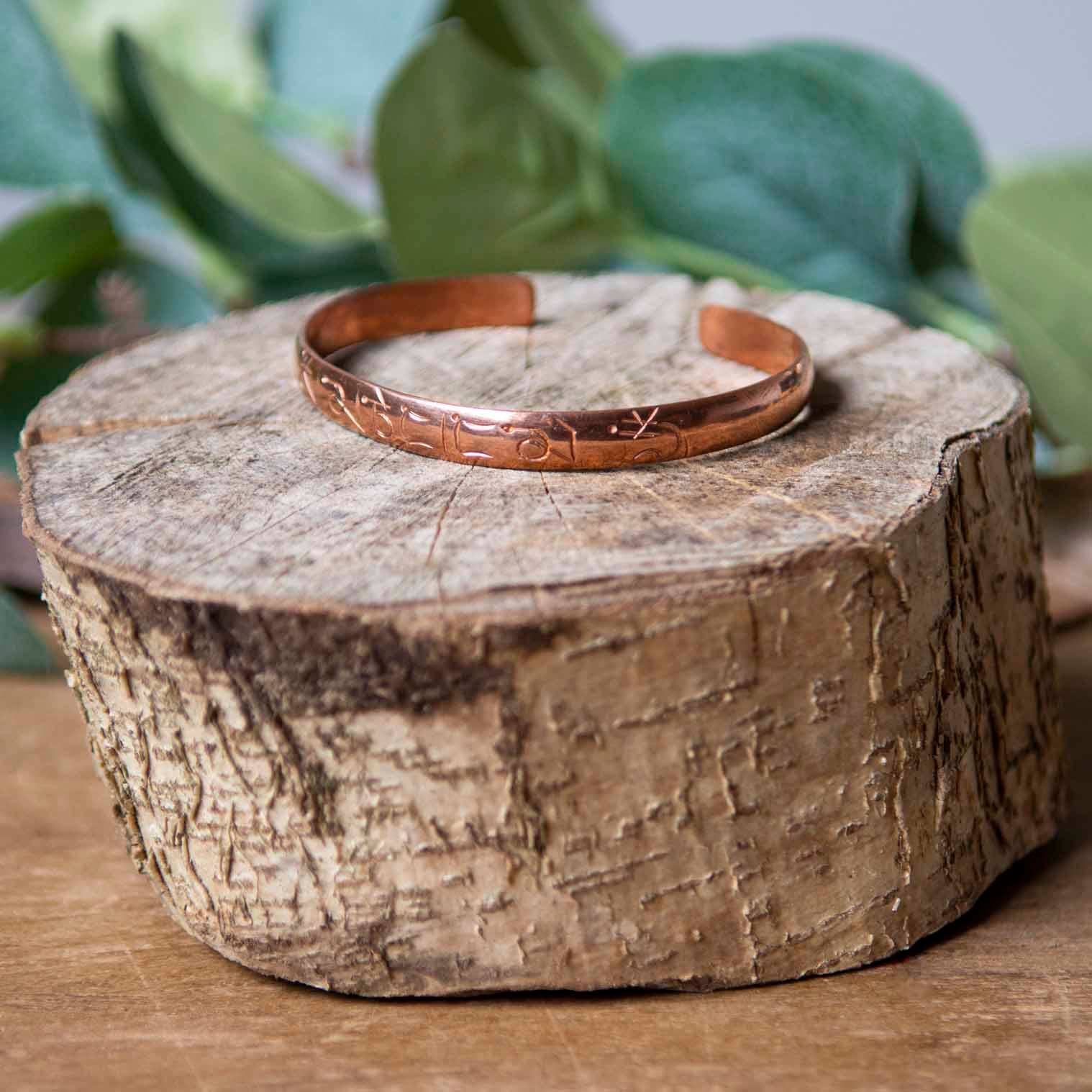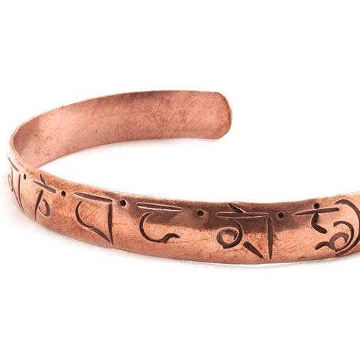 These beautiful copper bands have been hand etched with the Buddhist mantra Om Mani Padme Hum around the outside. They are adjustable to fit on any wrist.
